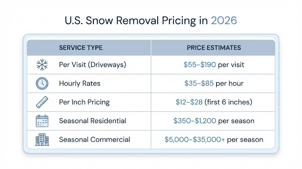 | Driveway Clearing | Per visit / per inch / flat rate | Size, slope, depth, and walkway add-ons |