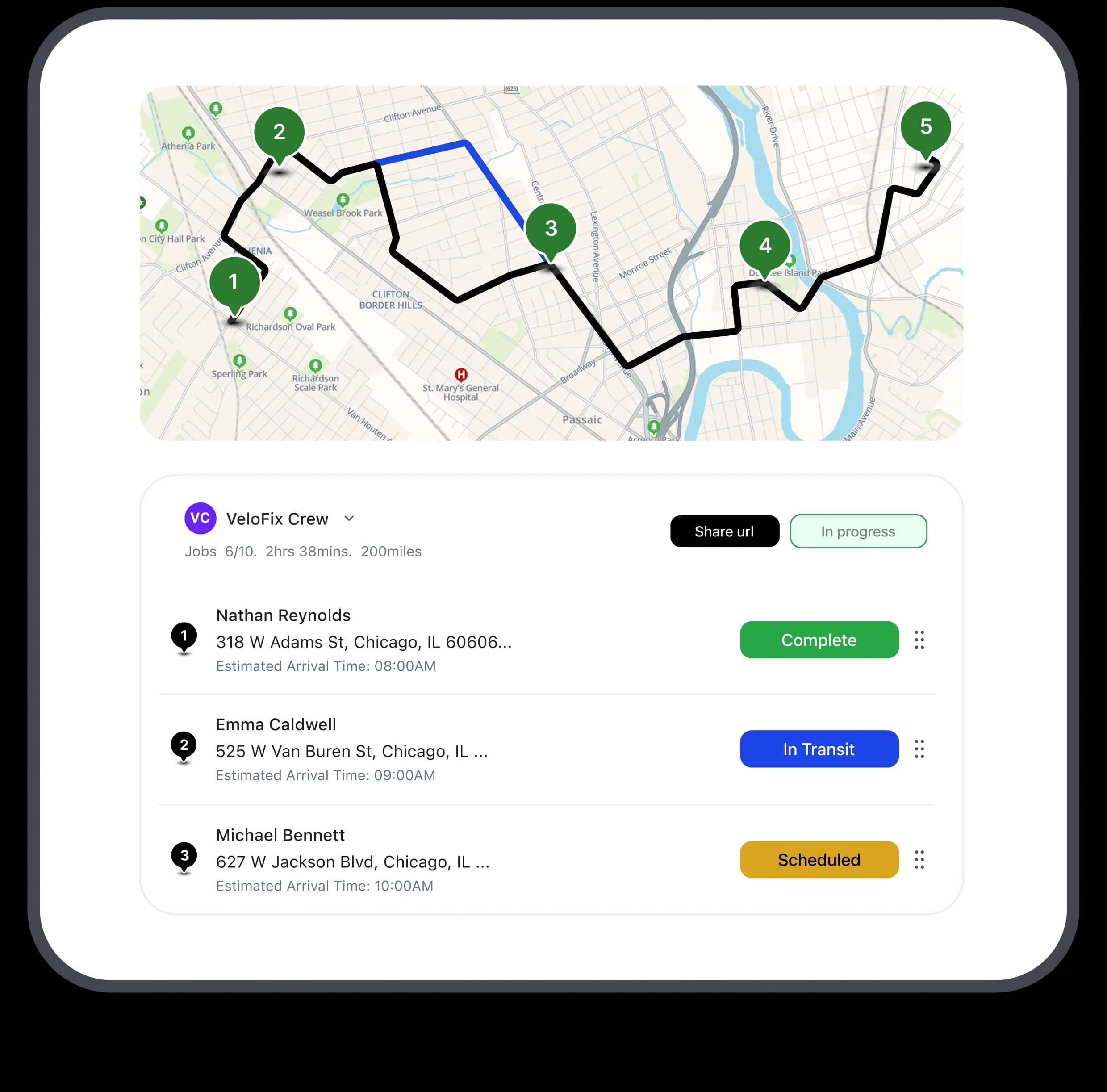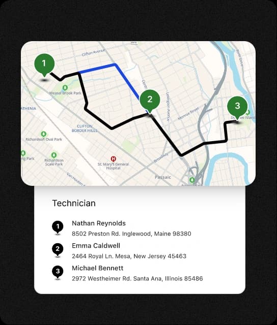 Every technician’s progress, location, and ETA update in real time, helping you see issues early and stay in control without micromanaging.