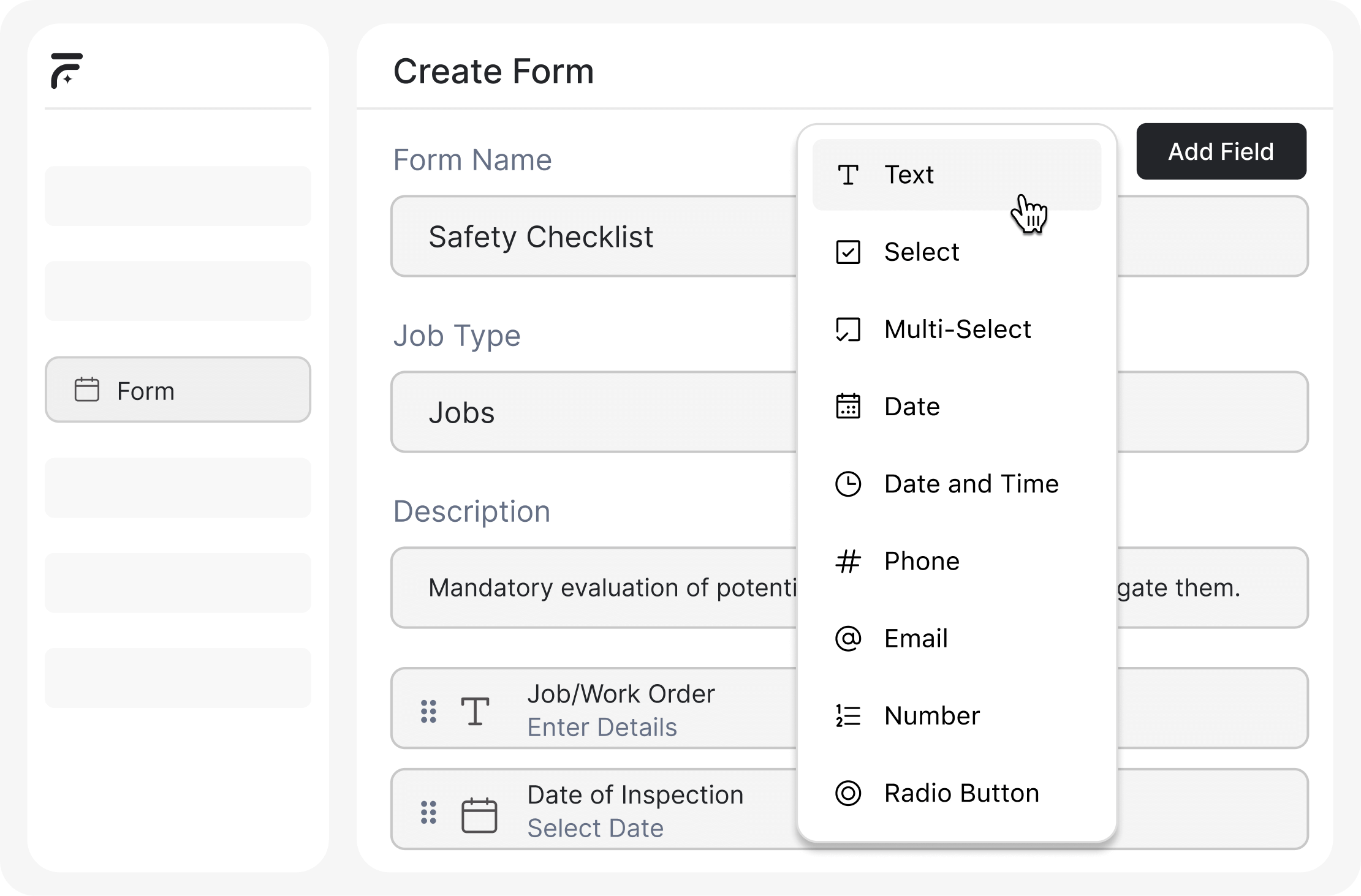 Drag. Drop. Design. Every job is different. Let FieldCamp’s form builder fit your process, not the other way around. Add fields, reorder steps, and make your checklist reflect exactly how your team works.