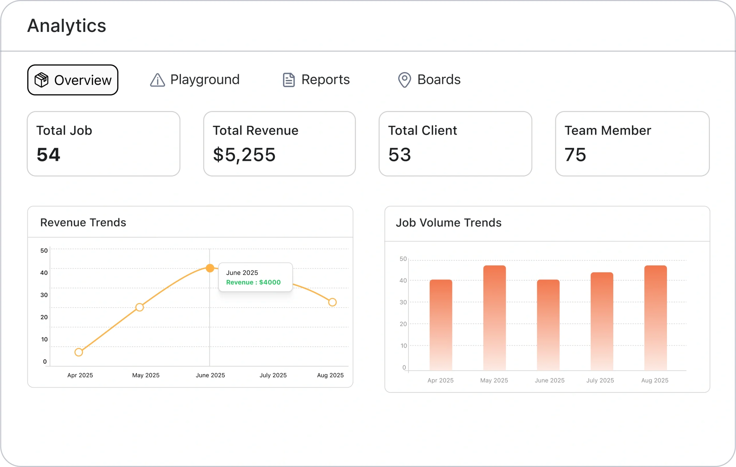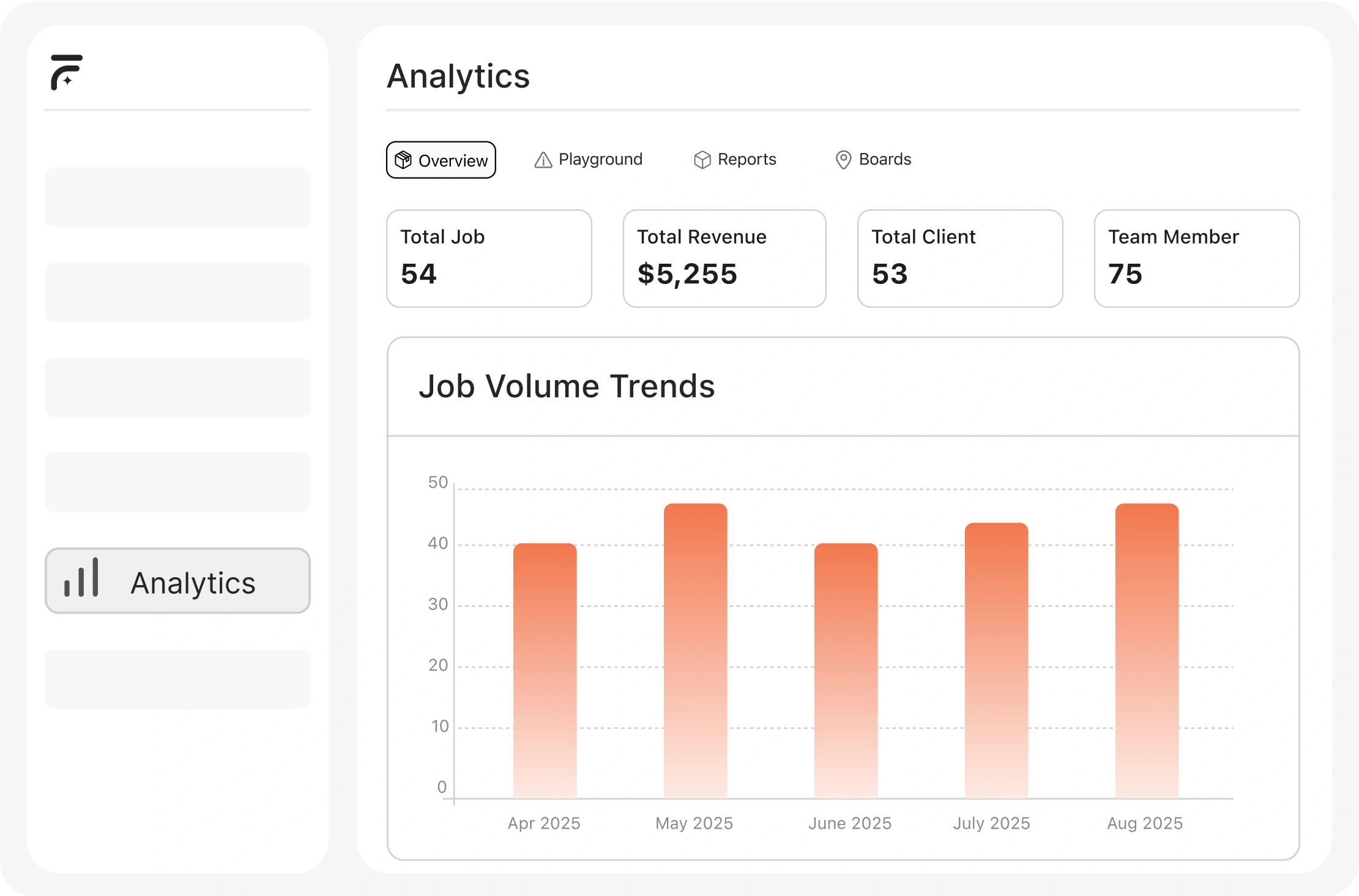 See your business performance live, not days later. FieldCamp’s unified analytics system pulls data from every module, such as jobs, clients, inventory, and team, to show the full picture instantly.