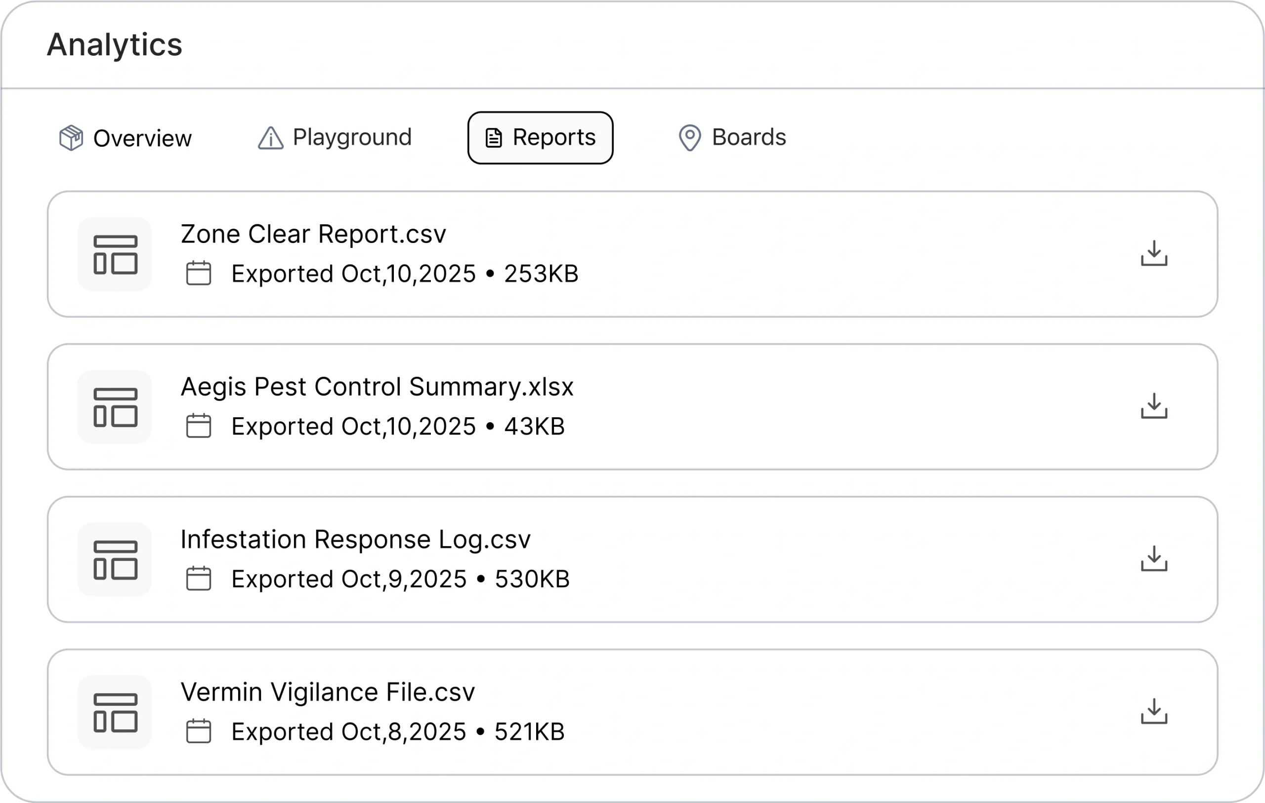Track recurring visits, treatment results, and technician activity with easy, automated reports.