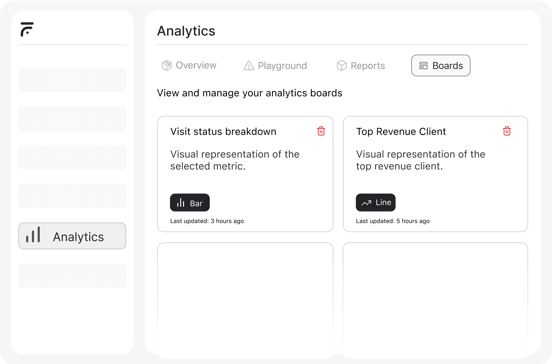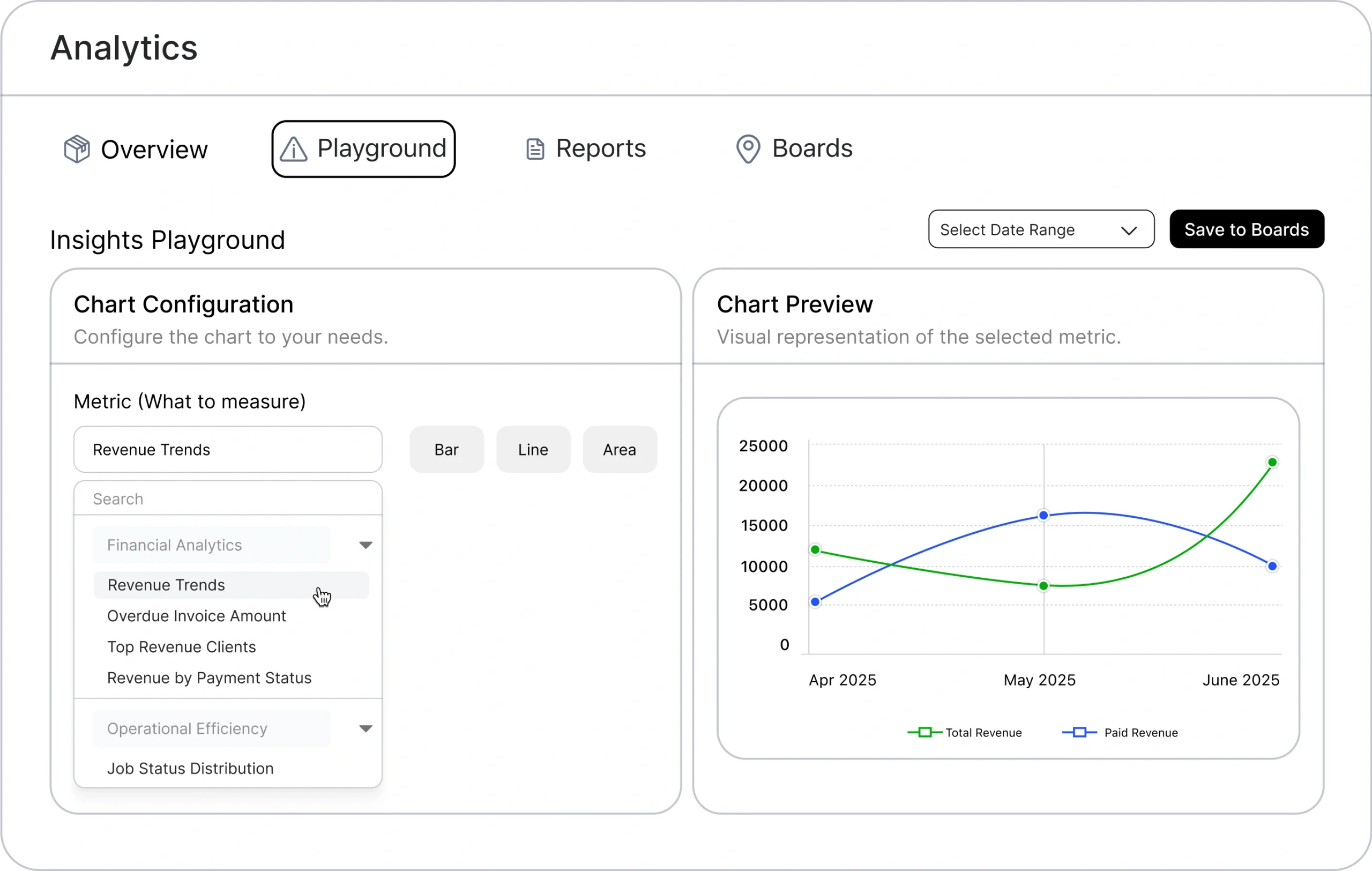 Build charts your way or let AI do it for you. FieldCamp’s interactive analytics playground lets you choose metrics, chart types, and filters, or generate smart visuals with AI recommendations.