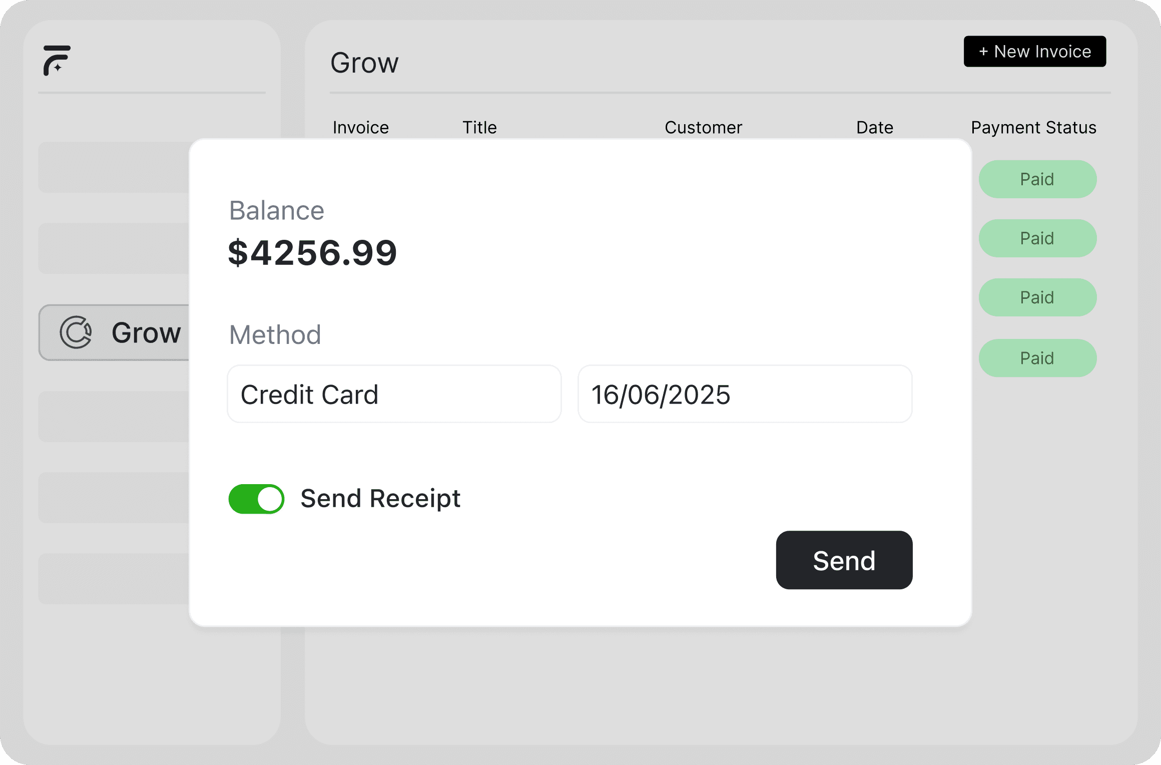 Let the money flow coming in effortlessly. Integrate stripe and accept card or digital wallet payments straight from the FieldCamp dashboard. A secure, fast, and perfectly organized payment method without any delays. Get paid on time, every time. No more chasing clients for invoices.