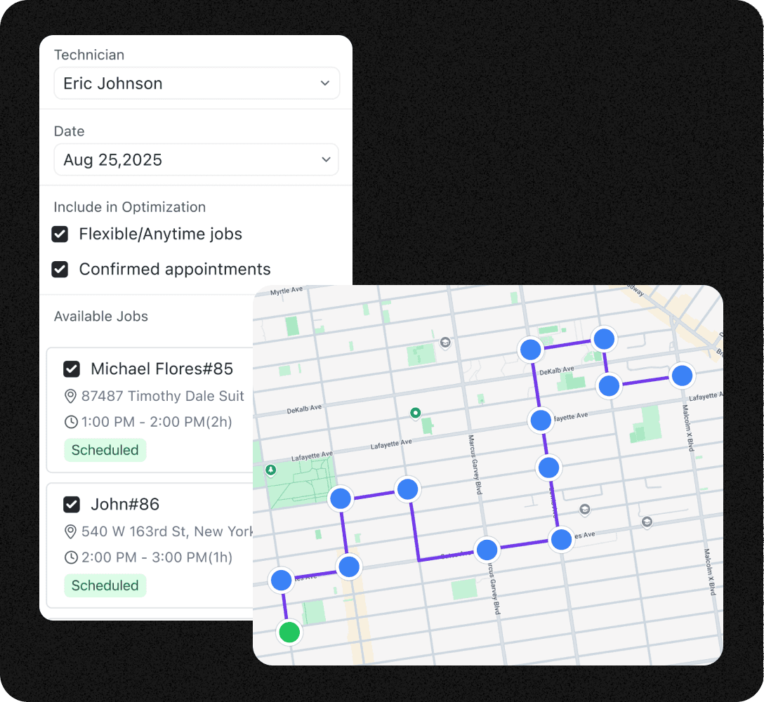 Cut drive time and costs with FieldCamp’s general contractor scheduling software, built to find the fastest routes so crews cover more jobs daily.