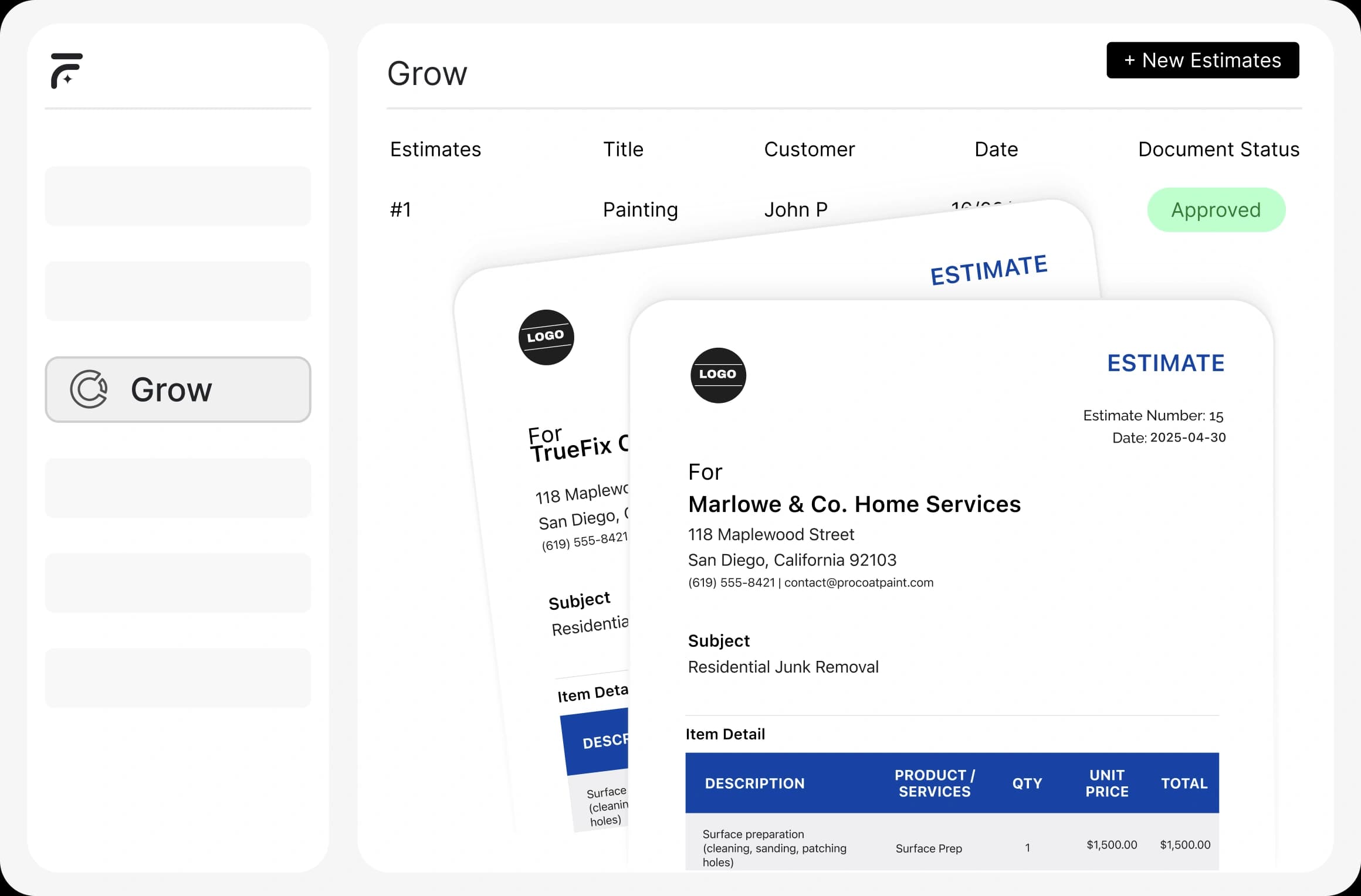 Build branded, professional estimates in minutes using FieldCamp’s handyman estimating app. Add labor, materials, and taxes once—AI remembers your pricing for future jobs. Convert approved estimates to invoices instantly and store them by client for easy recall during repeat service visits.