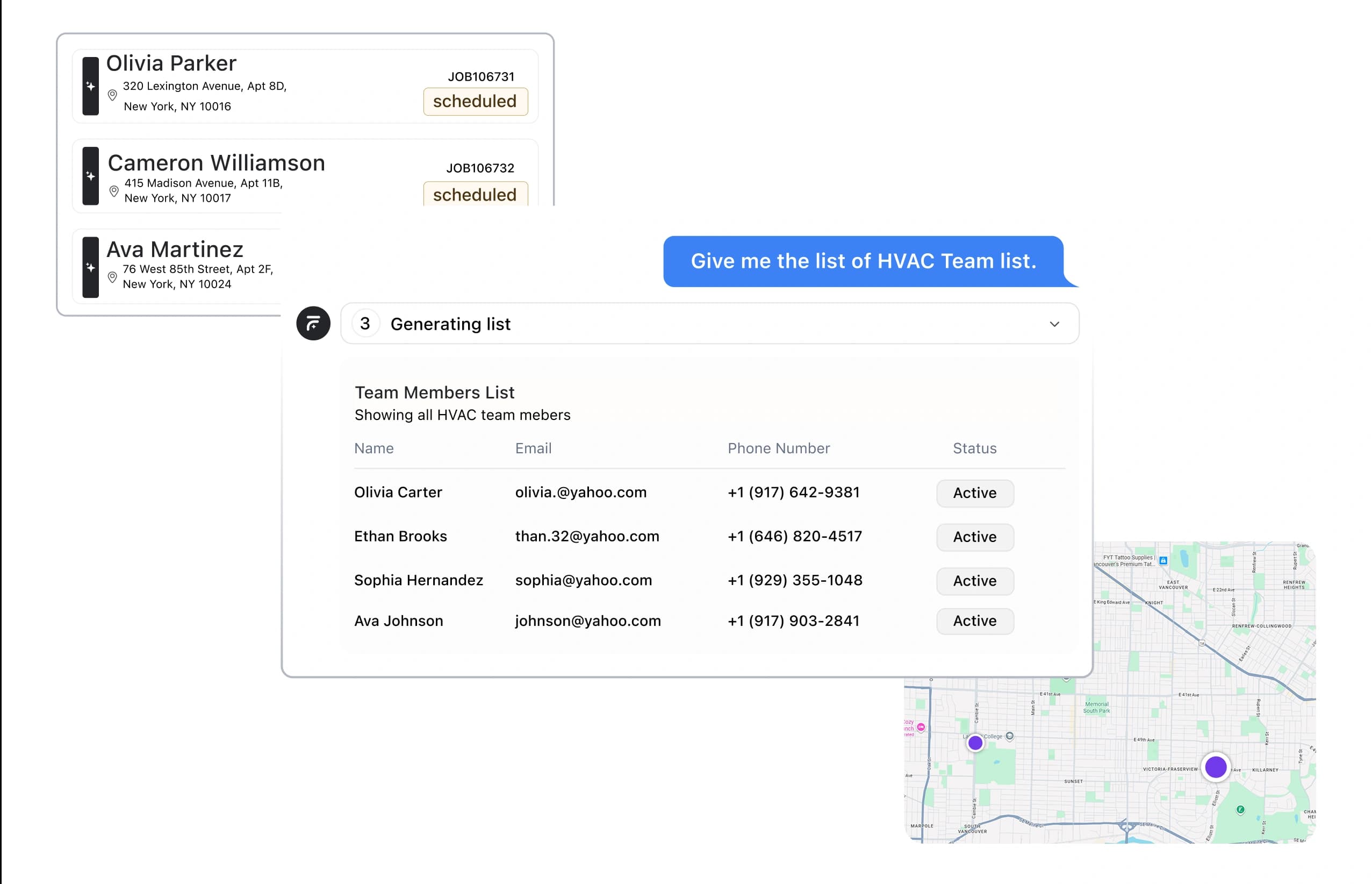 Get all the essential business insights simply by chatting and commanding. You can extract revenue reports, active client lists, every month’s profit margin data, real time scheduled events, etc. No digging through dashboards, just ask, and you’ll have real-time HVAC business metrics ready to take informed decisions.