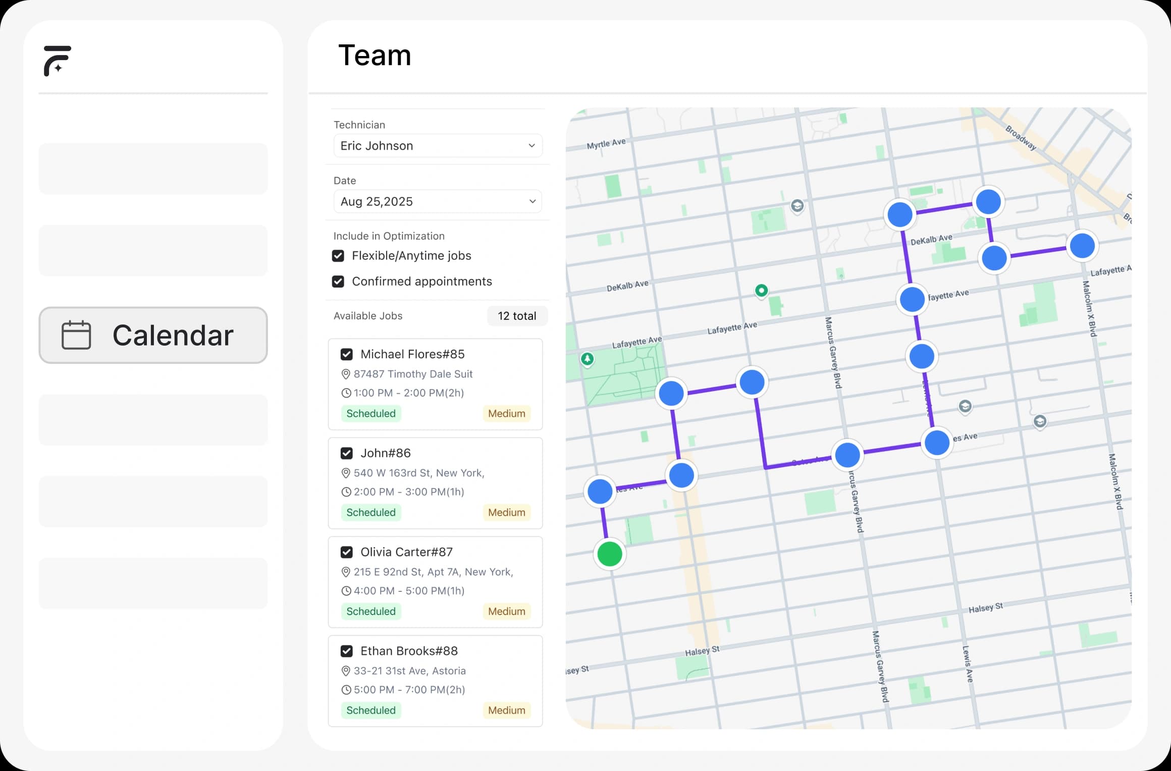No more double bookings, late arrivals, or empty miles. FieldCamp’s junk removal scheduling software keeps calendars automatically filled and perfectly optimized. It syncs live with Google Calendar so your team always knows where to go next. Unscheduled jobs? The AI auto-assigns the nearest crew to keep your day running smoothly.