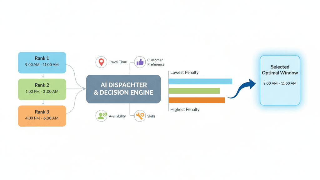 AI dispatchers evaluate all windows simultaneously against technician schedules, skills, and route efficiency. They apply graduated penalties based on preference ranking; the first choice gets priority, the second and third choices receive higher penalties if selected. The system picks the option that best balances customer preference with operational efficiency.