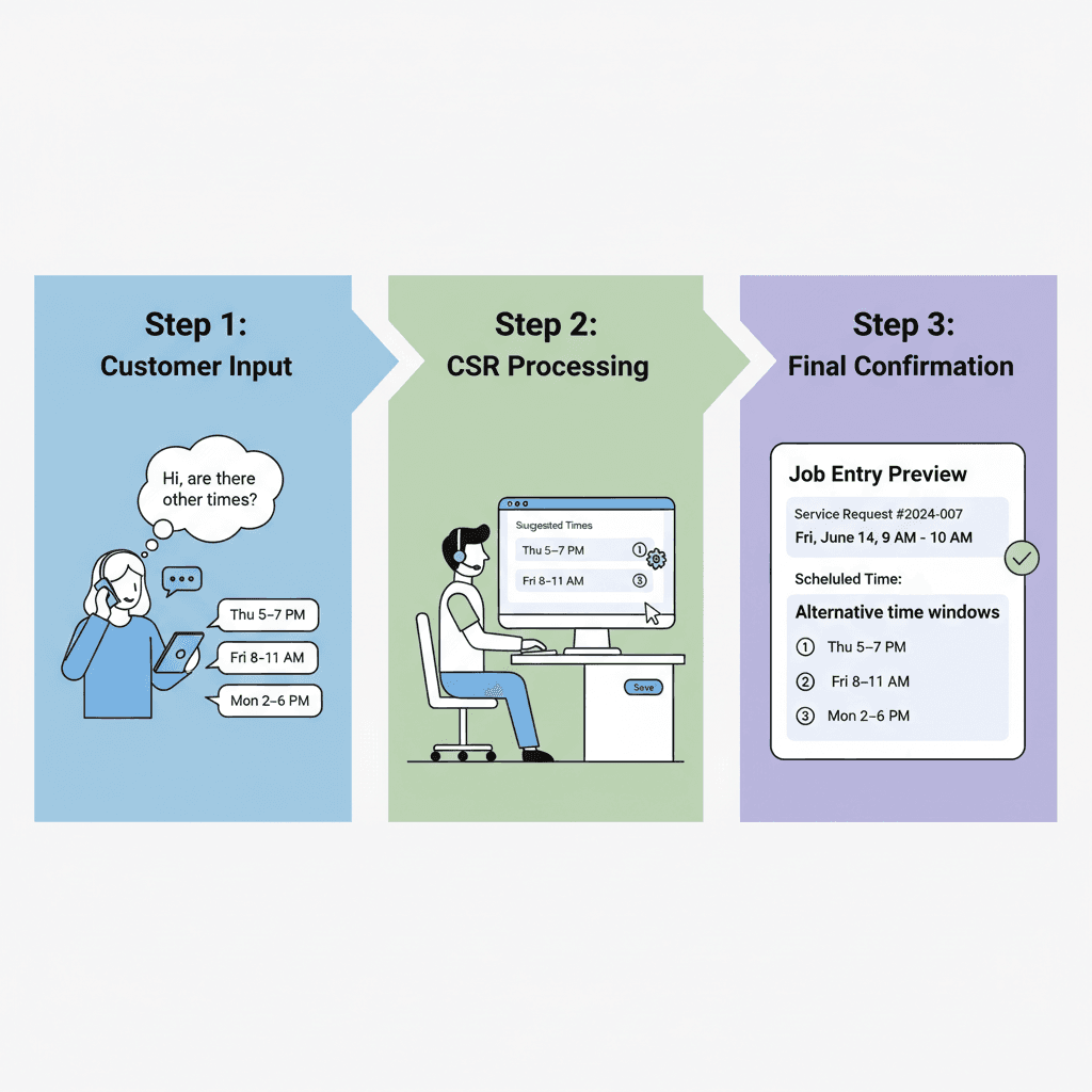 If that slot doesn’t work with technician availability, the job either gets scheduled outside the customer’s preference (creating friction) or requires a callback to negotiate a new time (wasting everyone’s time).
