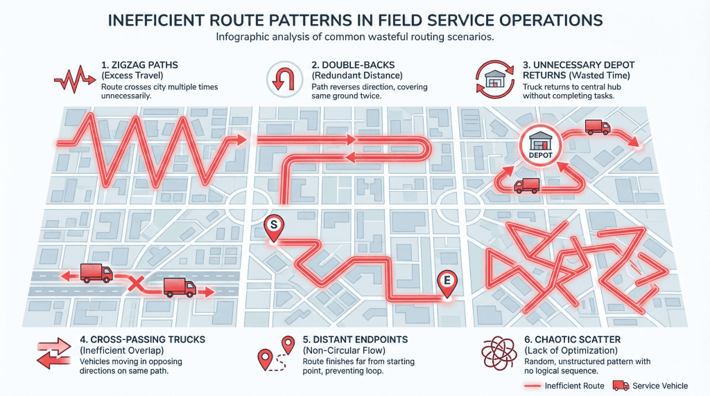 This happens when technicians jump between service zones without a logical geographic flow.