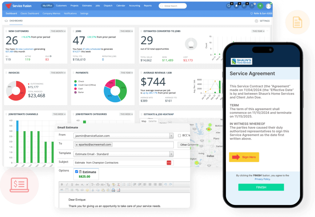 Service Fusion’s built-in payment processing lets you accept credit cards, ACH transfers, and checks. Technicians can generate invoices on-site, collect signatures, and process payments from the mobile app.